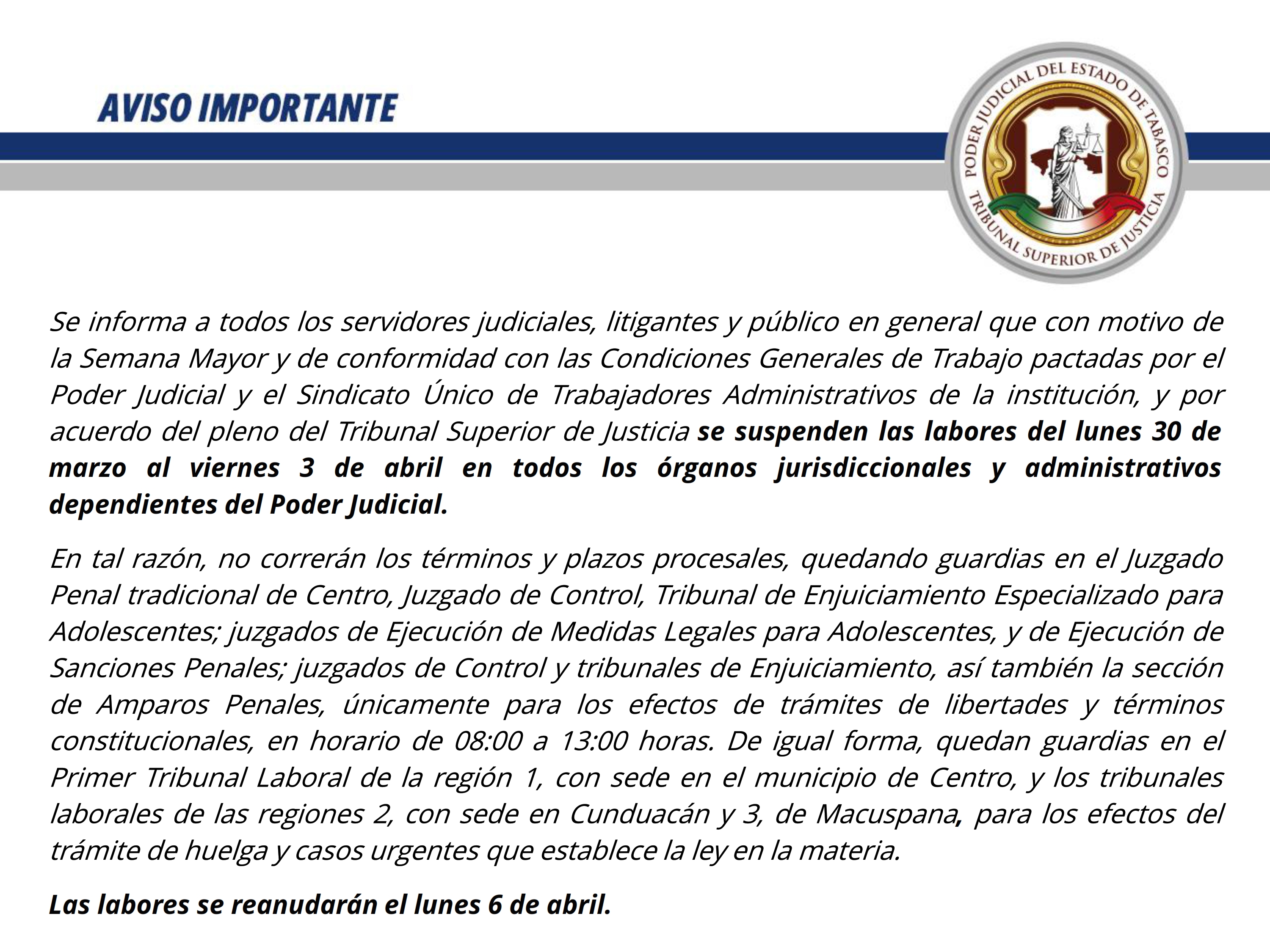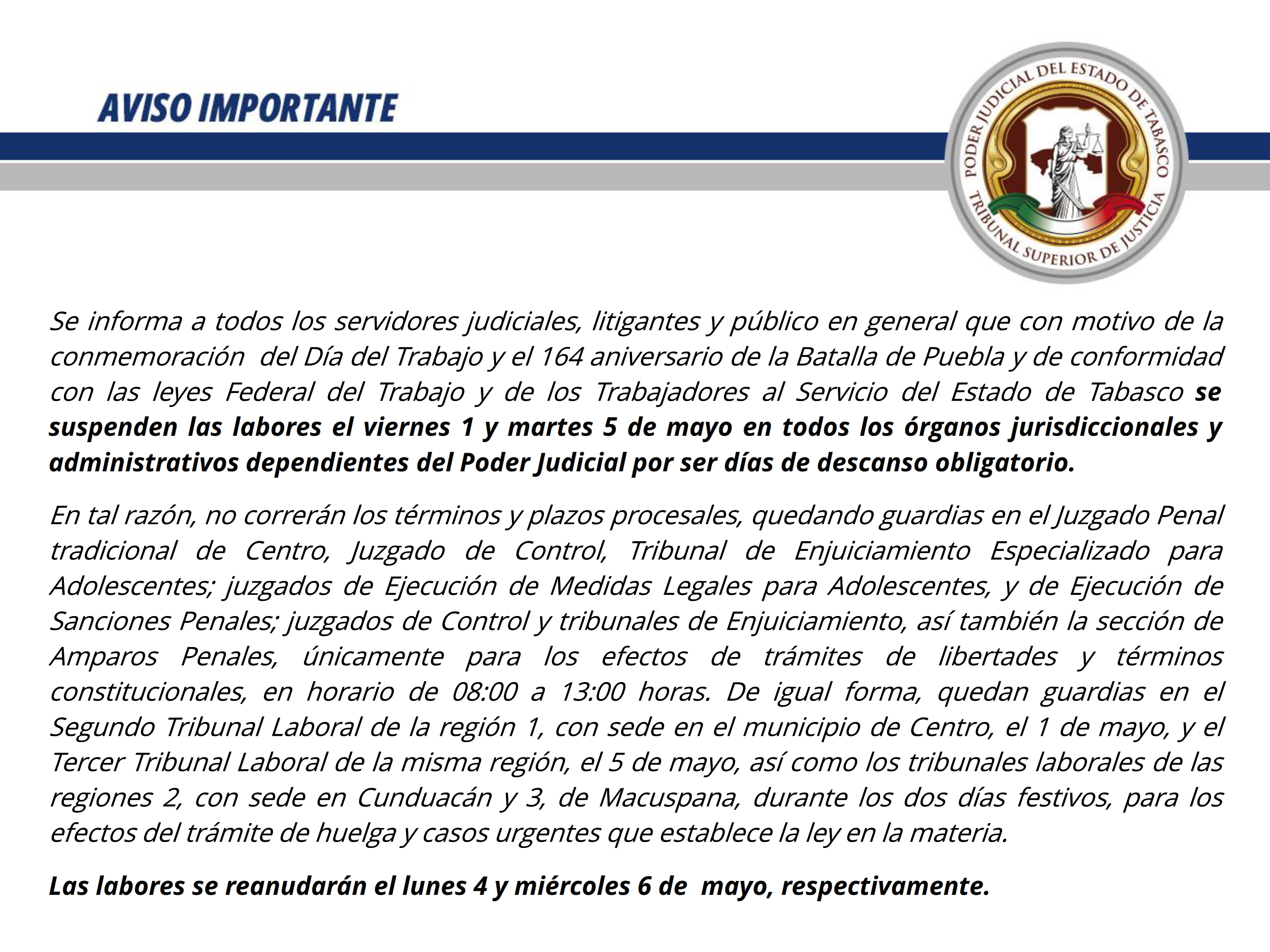Circular No. 05/2026. Suspensión de labores. Con motivo de celebrarse la semana mayor, el Poder Judicial suspenderá sus labores Jurisdiccionales, como de las áreas Administrativas y de apoyo, durante el período 30 de marzo al 03 de abril de 2026.