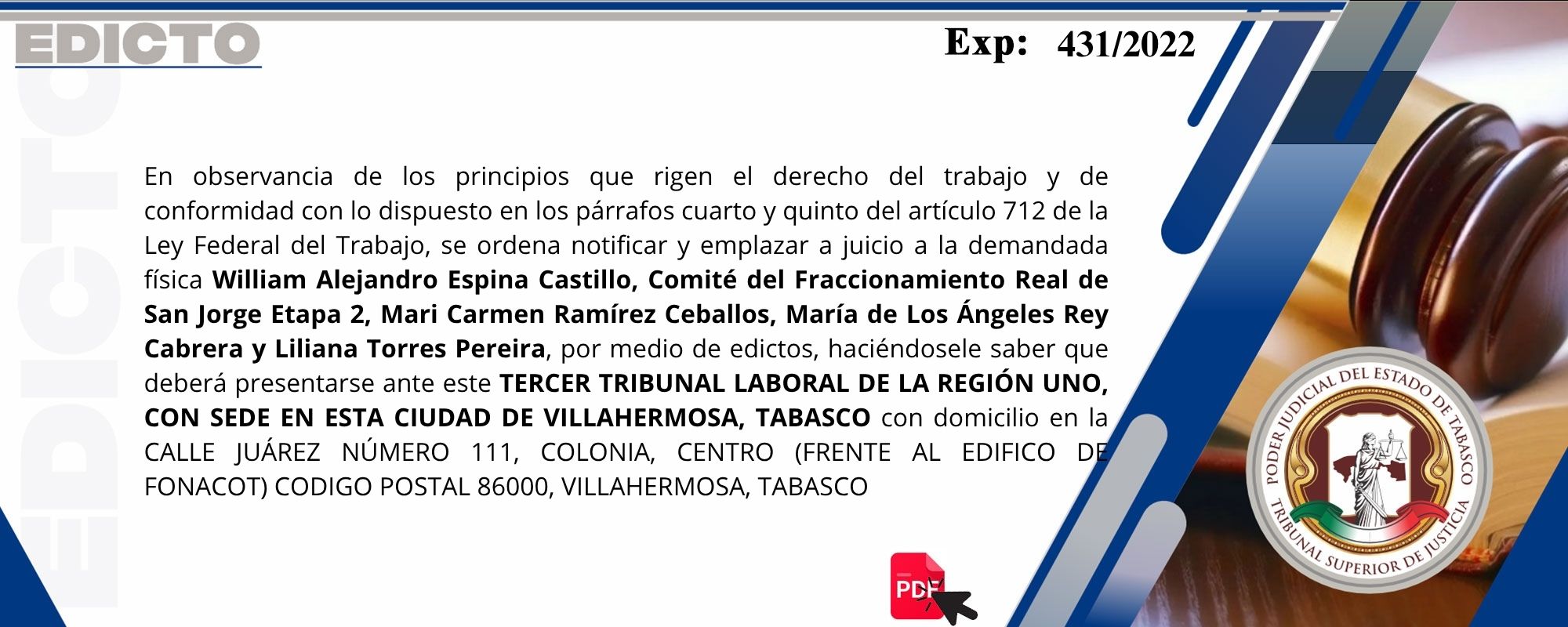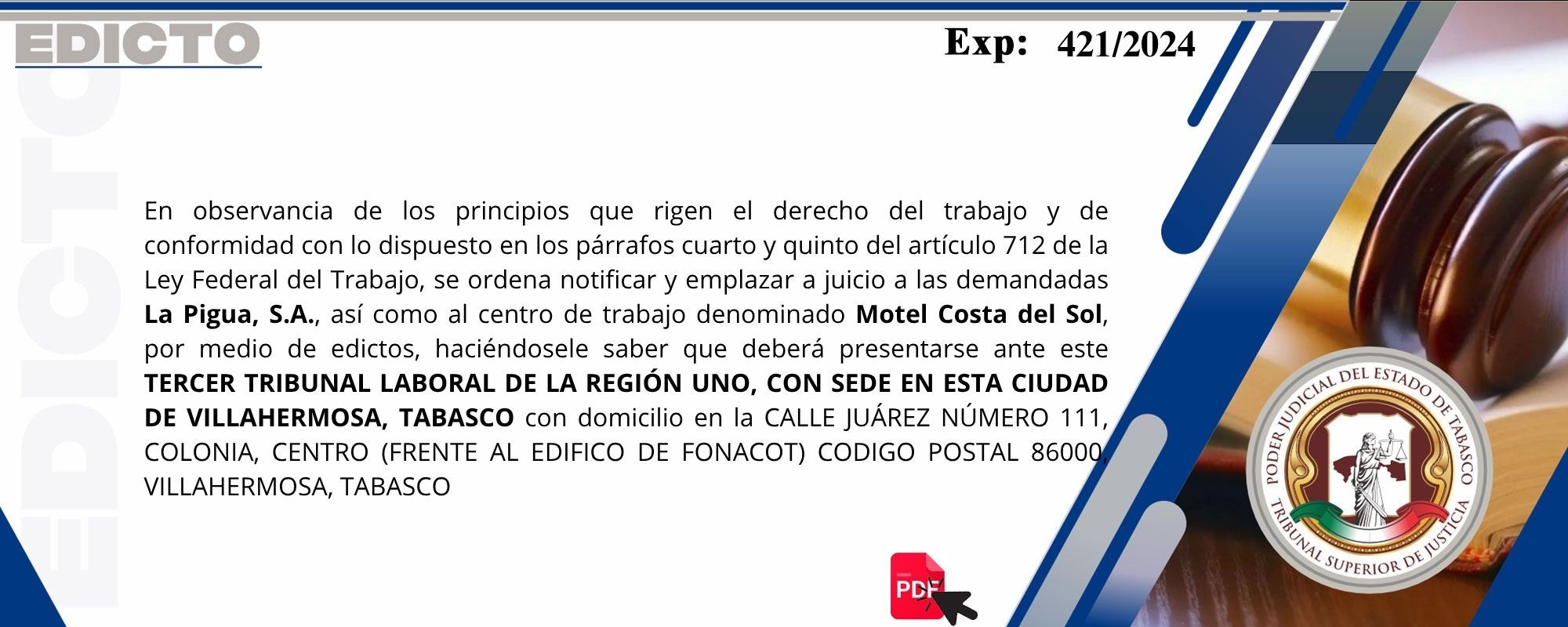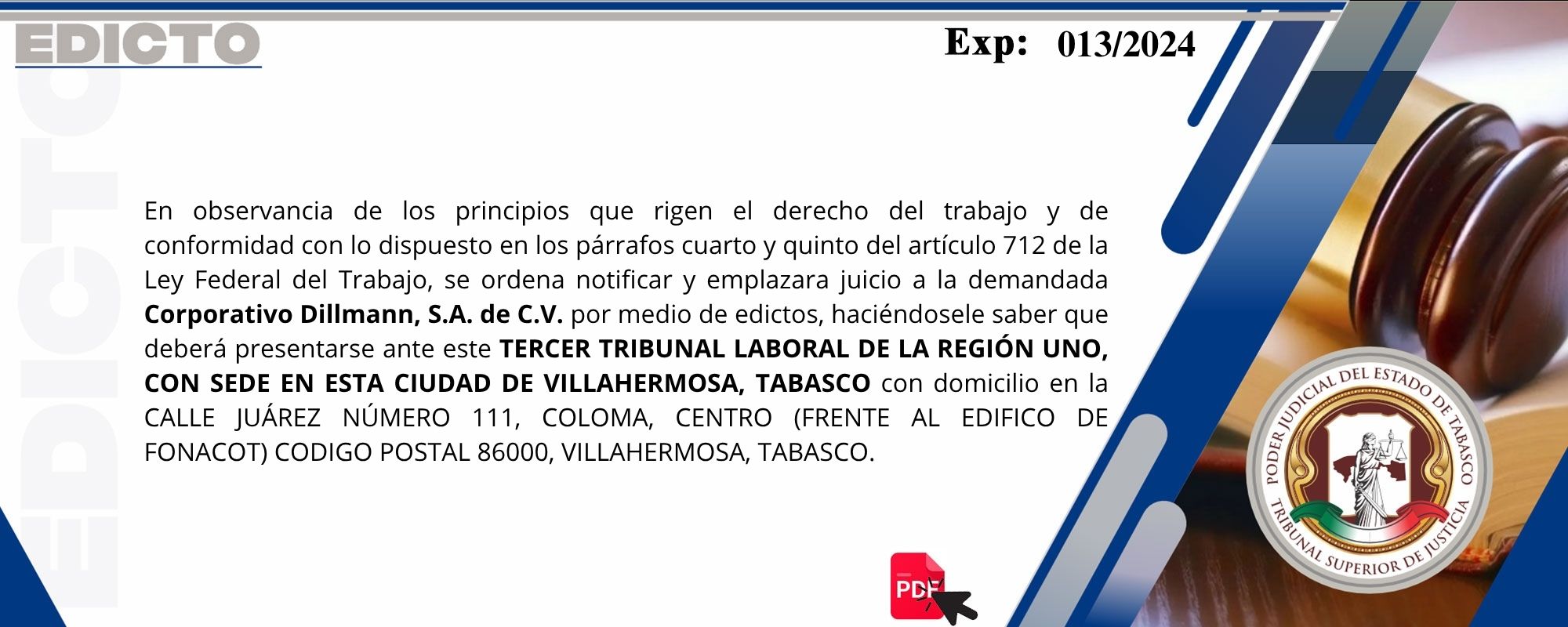 Concurso de puertas adornadas con material reciclado, convocado por el Voluntariado del Tribunal Superior de Justicia (TSJ) Leer boletín La familia judicial enaltece valores Leer boletín Signan convenio de colaboración para aplicar ley 3 de 3 en Tabasco Leer boletín Acuerdo General no. 04/2023. Supesión del Juzgado Penal de Primera Instancia de Cárdenas, Tabasco Circular 12/2023. Suspensión de Labores. Con motivo de celebrarse el ANIVERSARIO DE LA REVOLUCIÓN MEXICANA, así como el día del Trabajador Sindicalizado, el Poder Judicial del Estado suspenderá sus labores los días 20 y 21 de noviembre del presente año. Circular 11/2023. Suspensión labores los días 01, 02, y 03 de noviembre del año en curso. Acuerdo General 03/2023. Se crea el Centro de Acceso a la Justicia Alternativa con sede en Cardenas El Poder Judicial suspenderá sus labores Jurisdiccionales, asimismo, como de las áreas Administrativas y de apoyo, el día 15 de septiembre del presente año. Suspensión de Labores. el Primer período vacacional, será del 16 al 31 de Julio de 2023, por lo que se suspenden las labores Jurisdiccionales en el Poder Judicial del Estado y las administrativas en la presidencia. Acuerdo General Conjunto 01/2023. Se abroga el "Protocolo para la Nueva Normalidad del Poder Judicial del Estado de Tabasco" Servicios en Línea Lista de Acuerdos Boletin Judicial y Edictos Consulta de Expedientes Consignaciones y Pagos Redes Sociales Destacados Lista de acuerdos Correo electrónico Boletines Edictos Escuela Judicial Revista LRANJ Informes de Labores Declaración Patrimonial Convocatorias Consignaciones y Pagos Acuerdos del Pleno Magistrados del TSJ Consignaciones y Pagos (Pago en Linea) Notificaciones por Lista en Materia Laboral