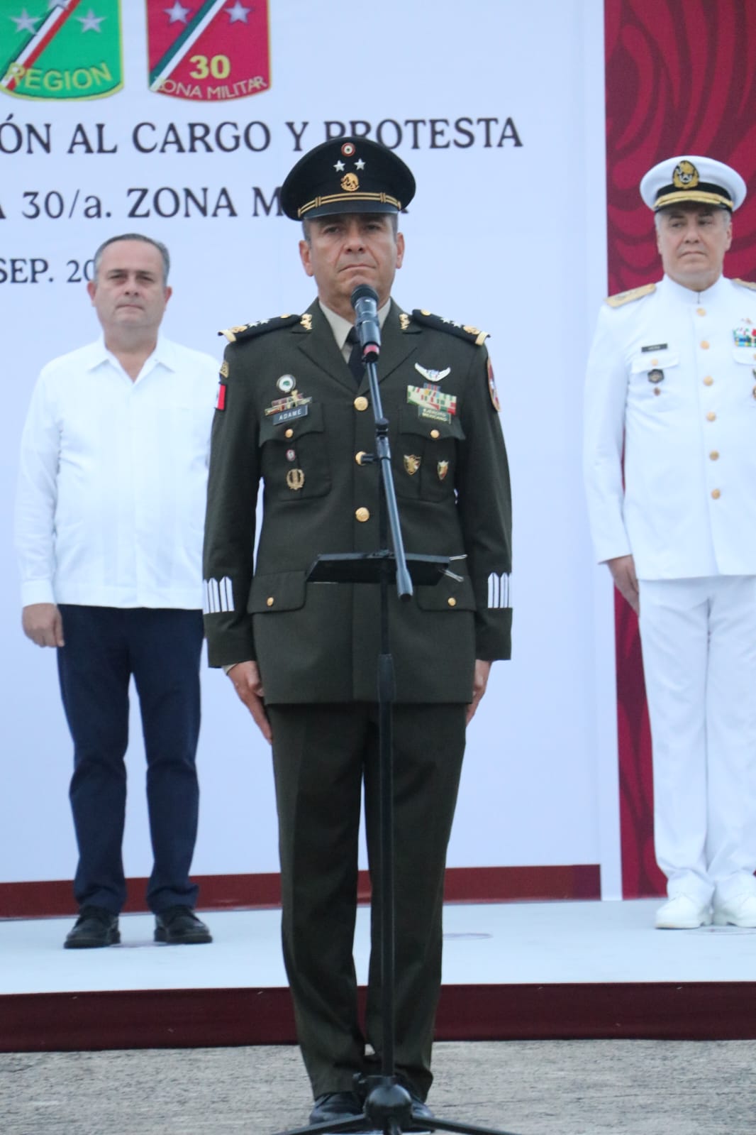 En una ceremonia oficial tal como lo dicta el protocolo militar este martes se realizó la toma de protesta, posesión al cargo y protesta de bandera del general de Brigada de Estado Mayor, Jesús Alejandro Adame Cabrera como comandante de la Trigésima Zona Militar.