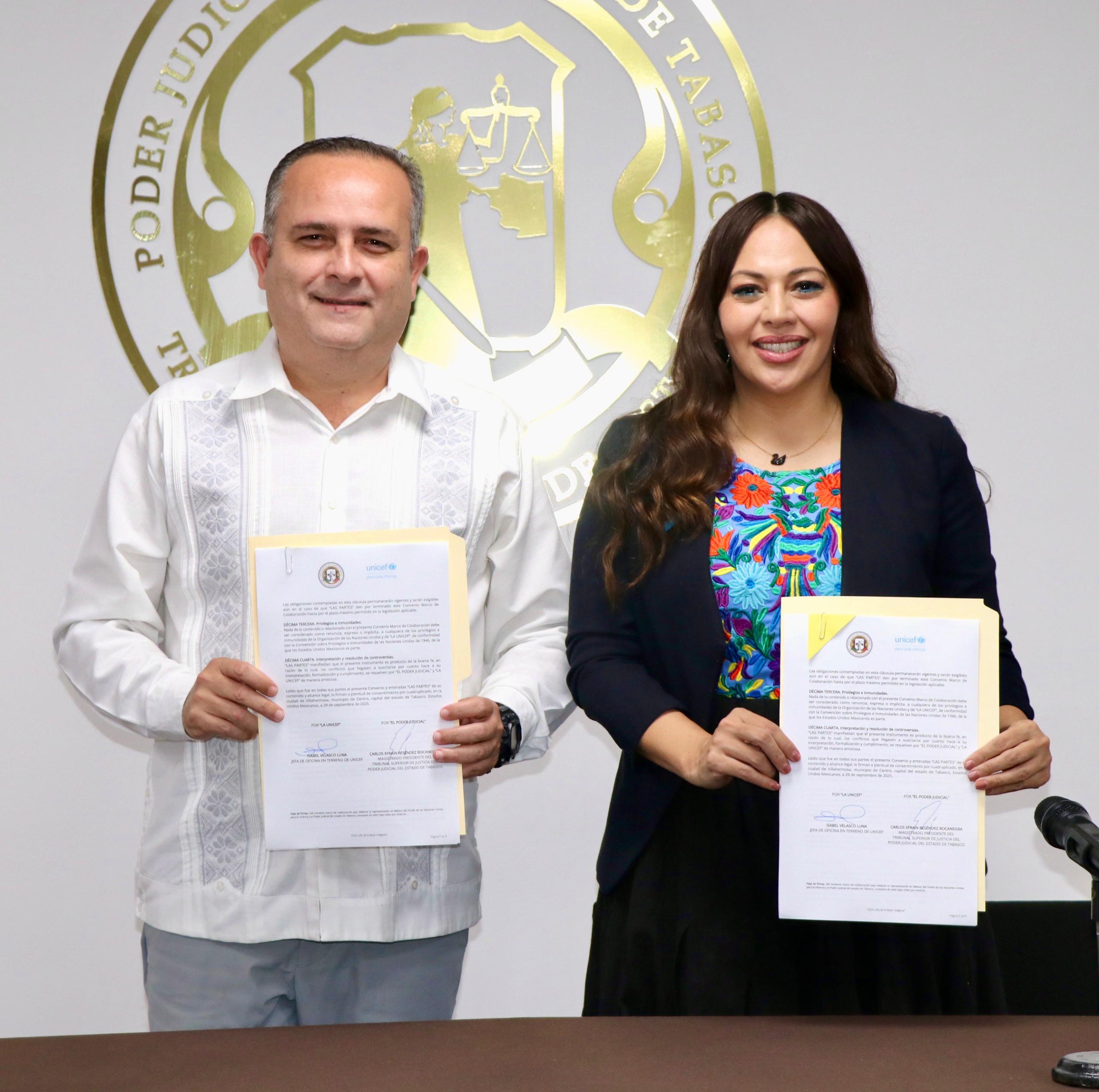 El Tribunal Superior de Justicia de Tabasco y el Fondo de Naciones Unidas para la Infancia (Unicef) firmaron un convenio de colaboración para desarrollar programas y acciones conjuntas que fortalezcan la protección de los derechos de niñas, niños y adolescentes. El acuerdo incluye la creación de Salas de Audiencias para Personas en Condición de Vulnerabilidad (SAPCOV) y Salas Especializadas para la Participación Infantil y Adolescente (SEPIA), donde UNICEF aportará mobiliario, equipo tecnológico y capacitación especializada para jueces, psicólogos y trabajadores sociales.