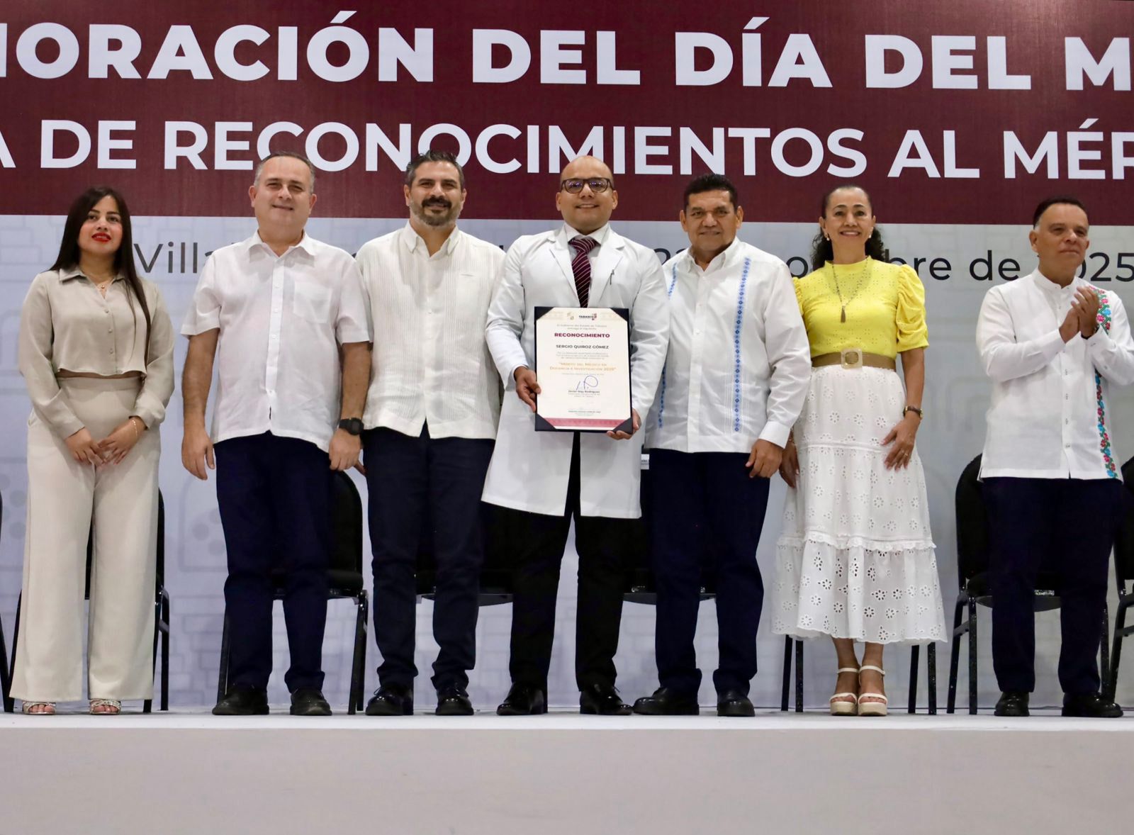 En esta ocasión se entregaron reconocimientos al Mérito Médico a los doctores Adrián Jerónimo Facundo, del Instituto de Seguridad y Servicios Sociales de los Trabajadores del Estado (ISSSET), y Sergio Quiroz Gómez, de la Universidad Juárez Autónoma de Tabasco (UJAT), por su destacada trayectoria en los ámbitos clínico, docente y de investigación.