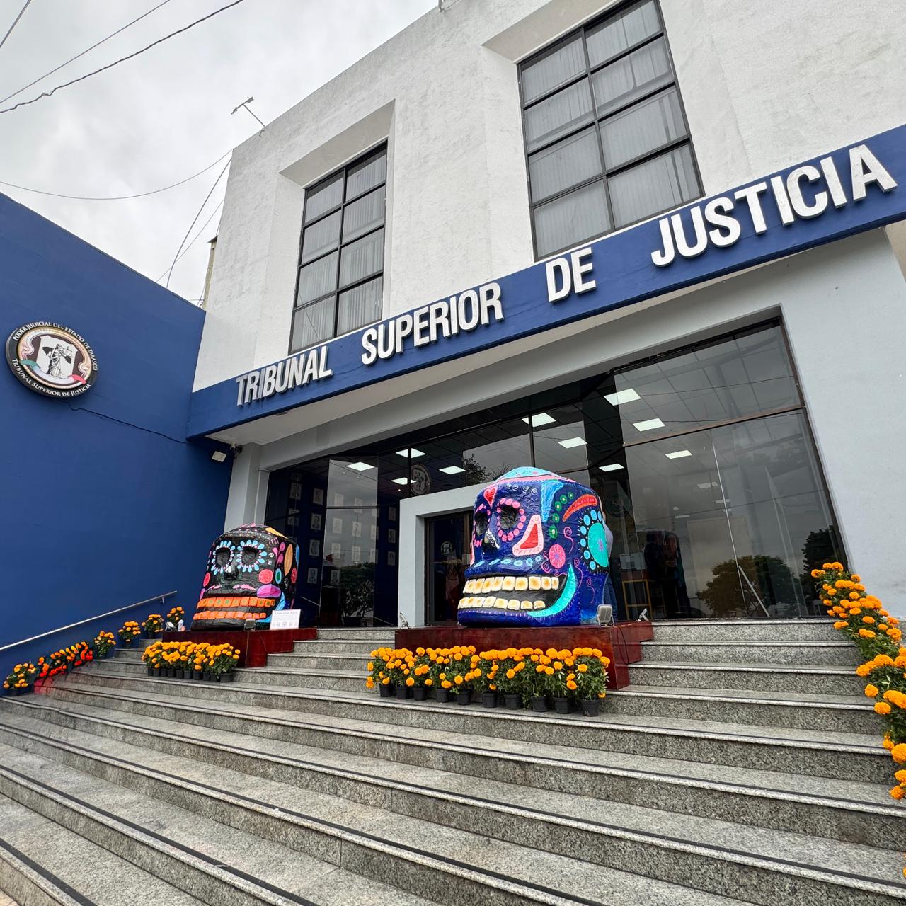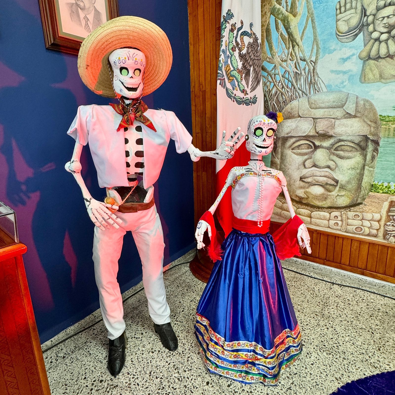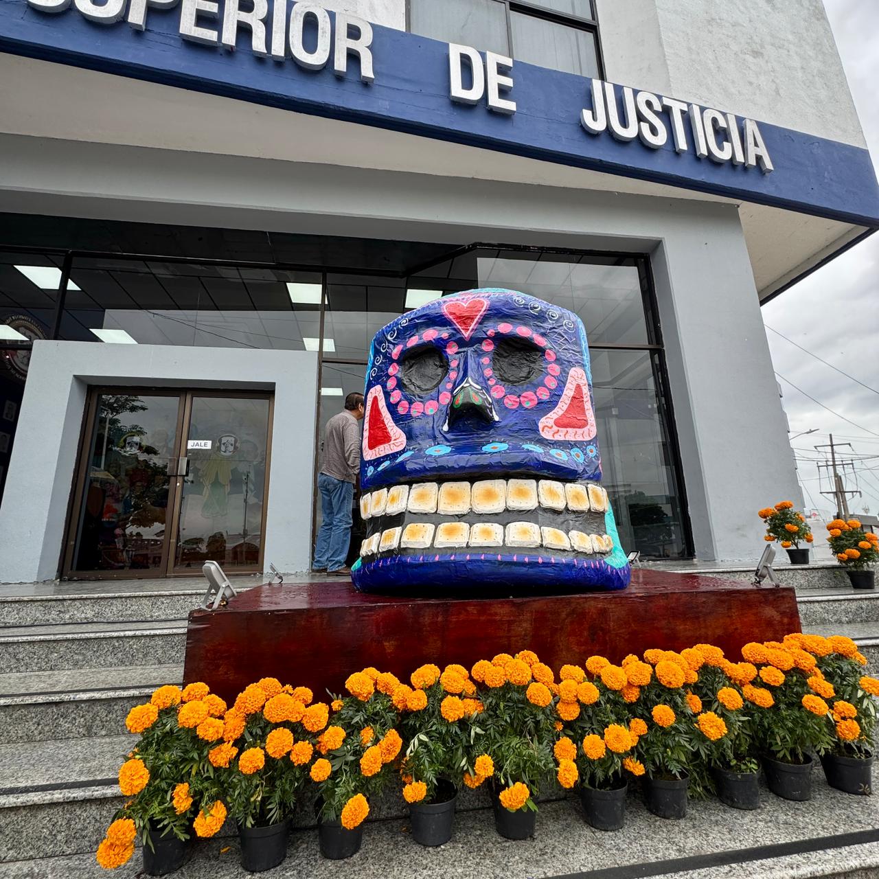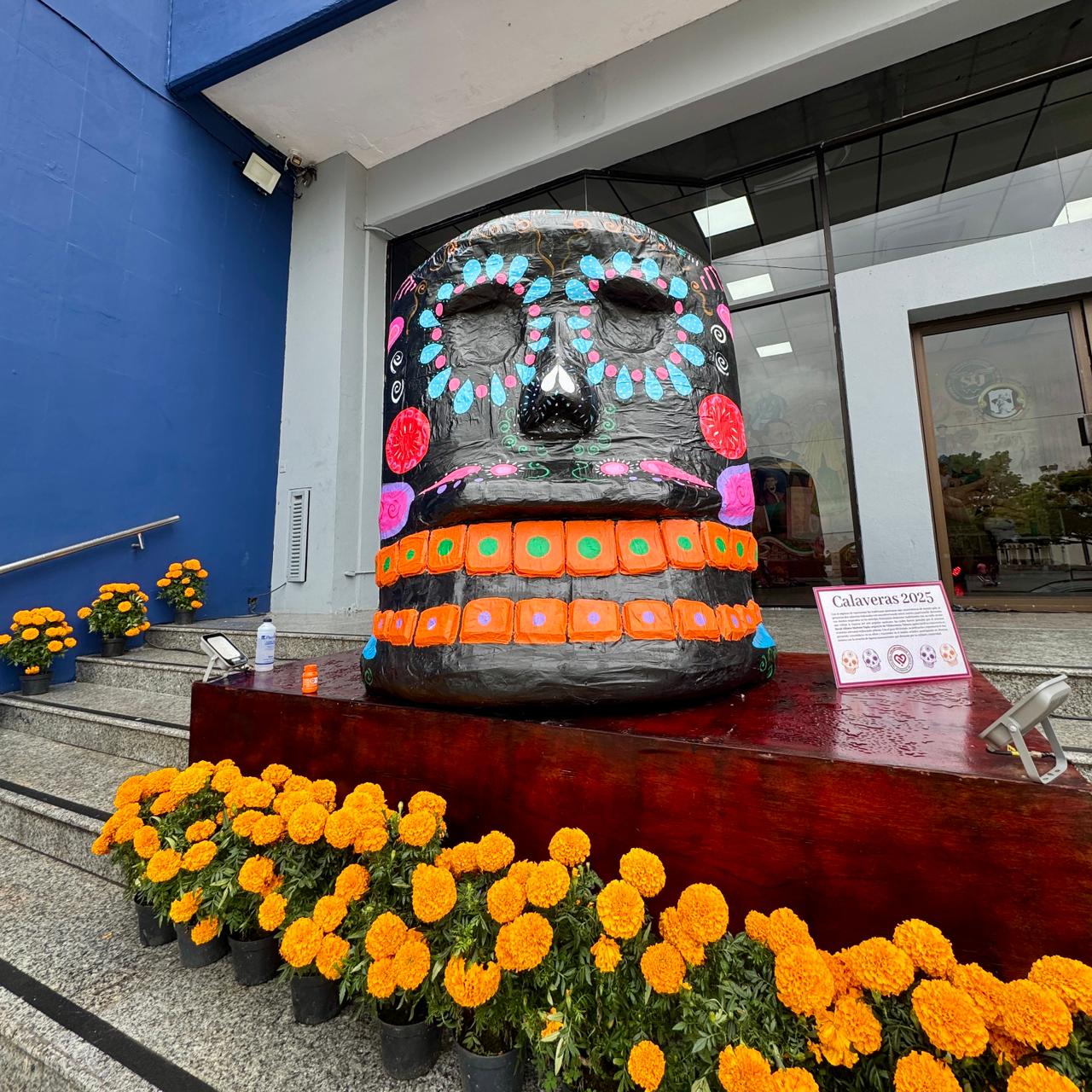 edificio sede, donde dos grandes calaveras elaboradas en papel maché adornan la