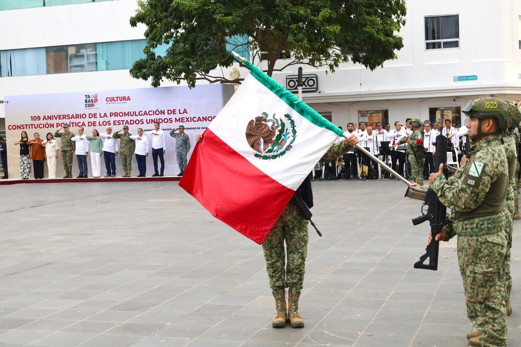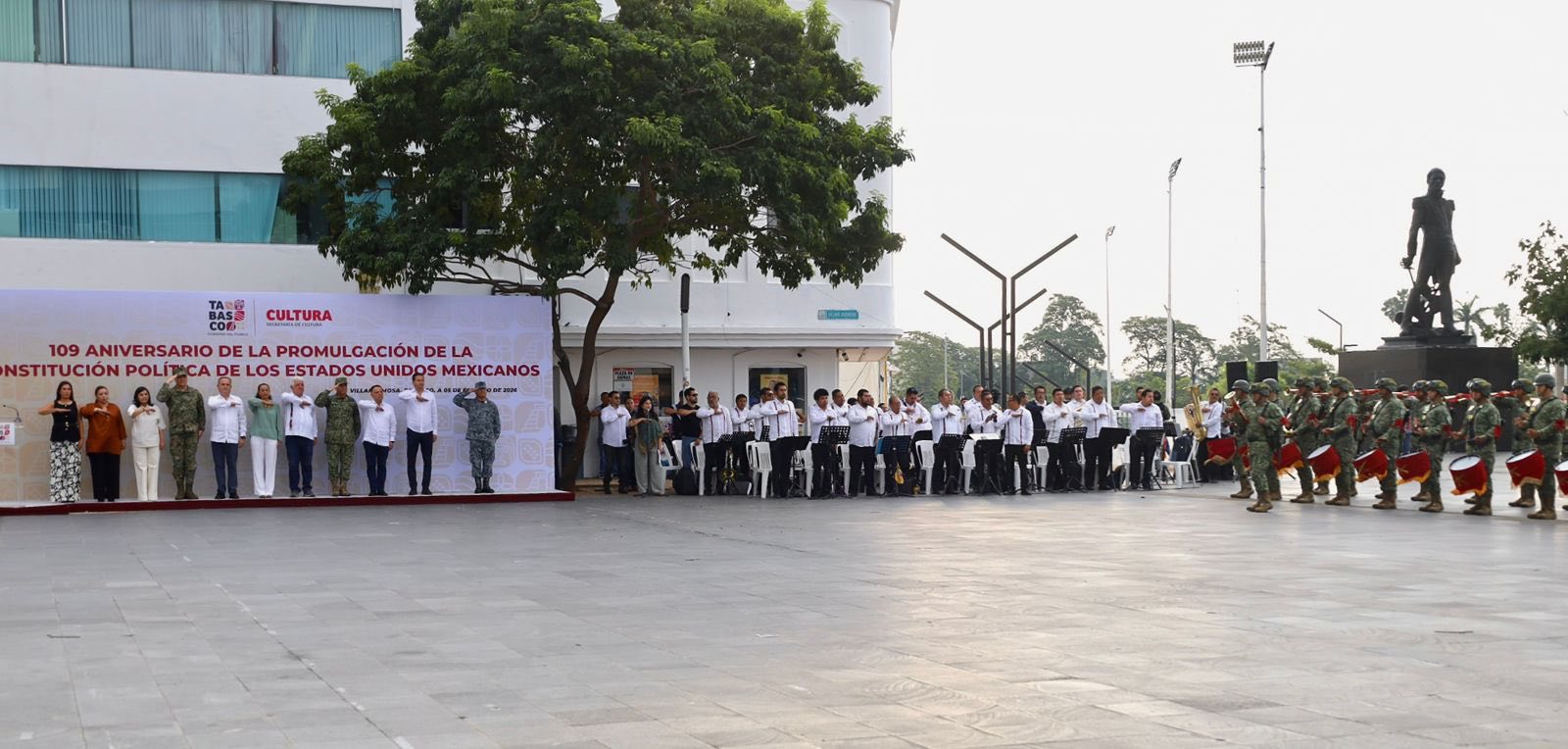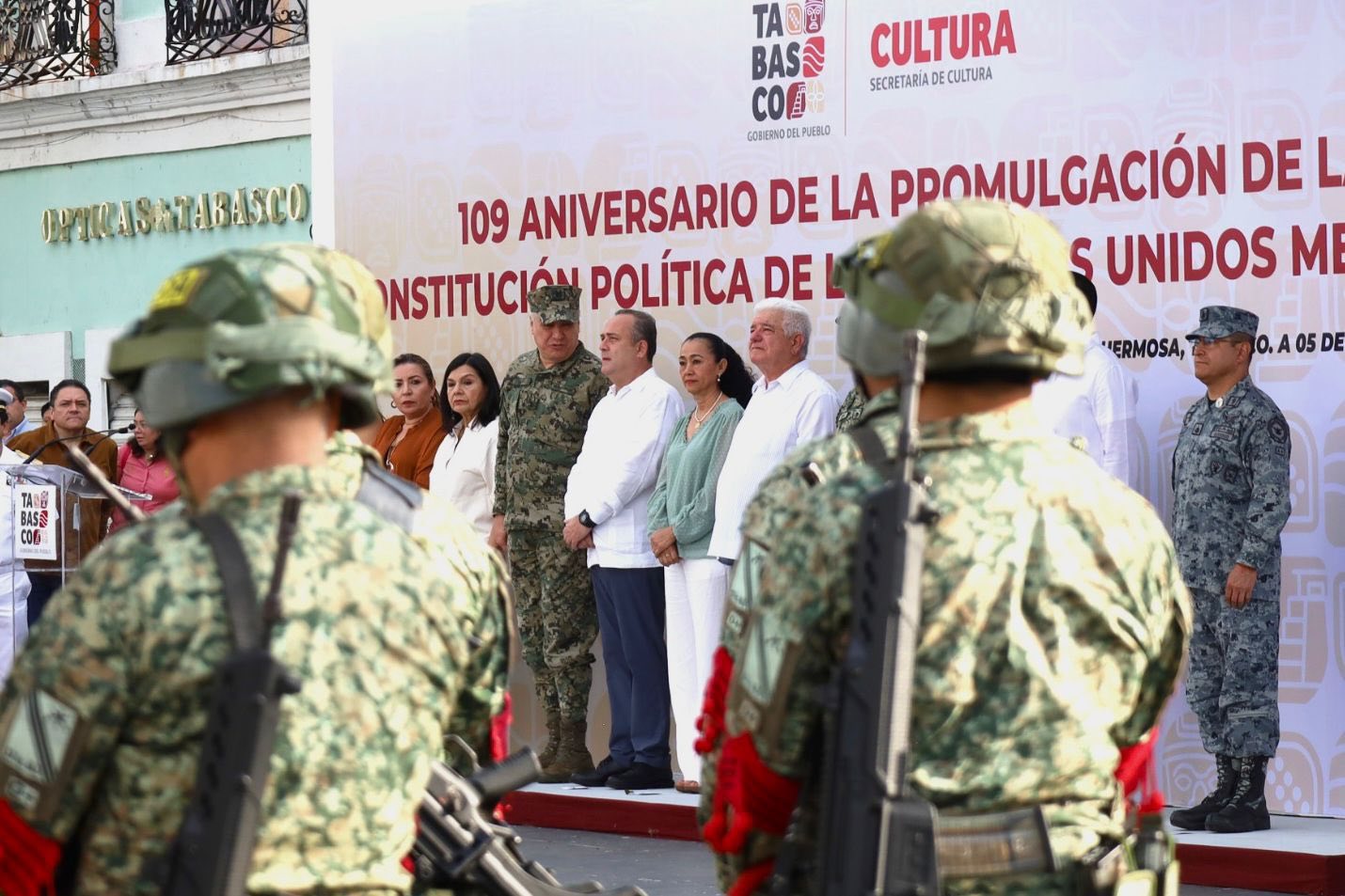 Autoridades de los tres órdenes de gobierno, encabezados por el secretario de Gobierno, José Ramiro López Obrador, en representación del gobernador Javier May Rodríguez, conmemoraron el 109 aniversario de la promulgación de la Constitución Política de los Estados Unidos Mexicanos, durante el acto cívico realizado en la explanada de Plaza de Armas, en el que estuvo presente la presidenta honoraria del sistema DIF Tabasco, Aurora Raleigh de la Cruz.