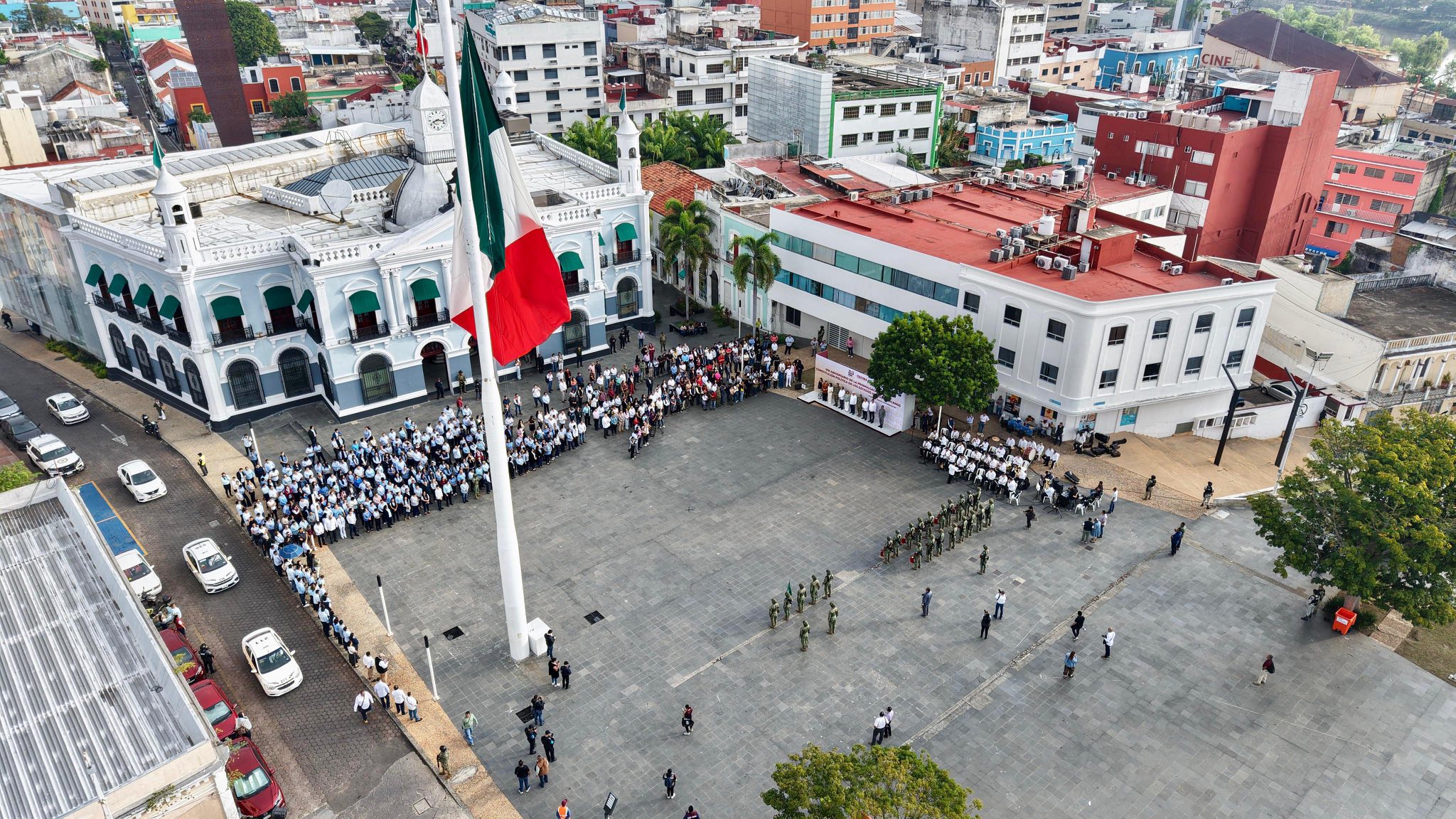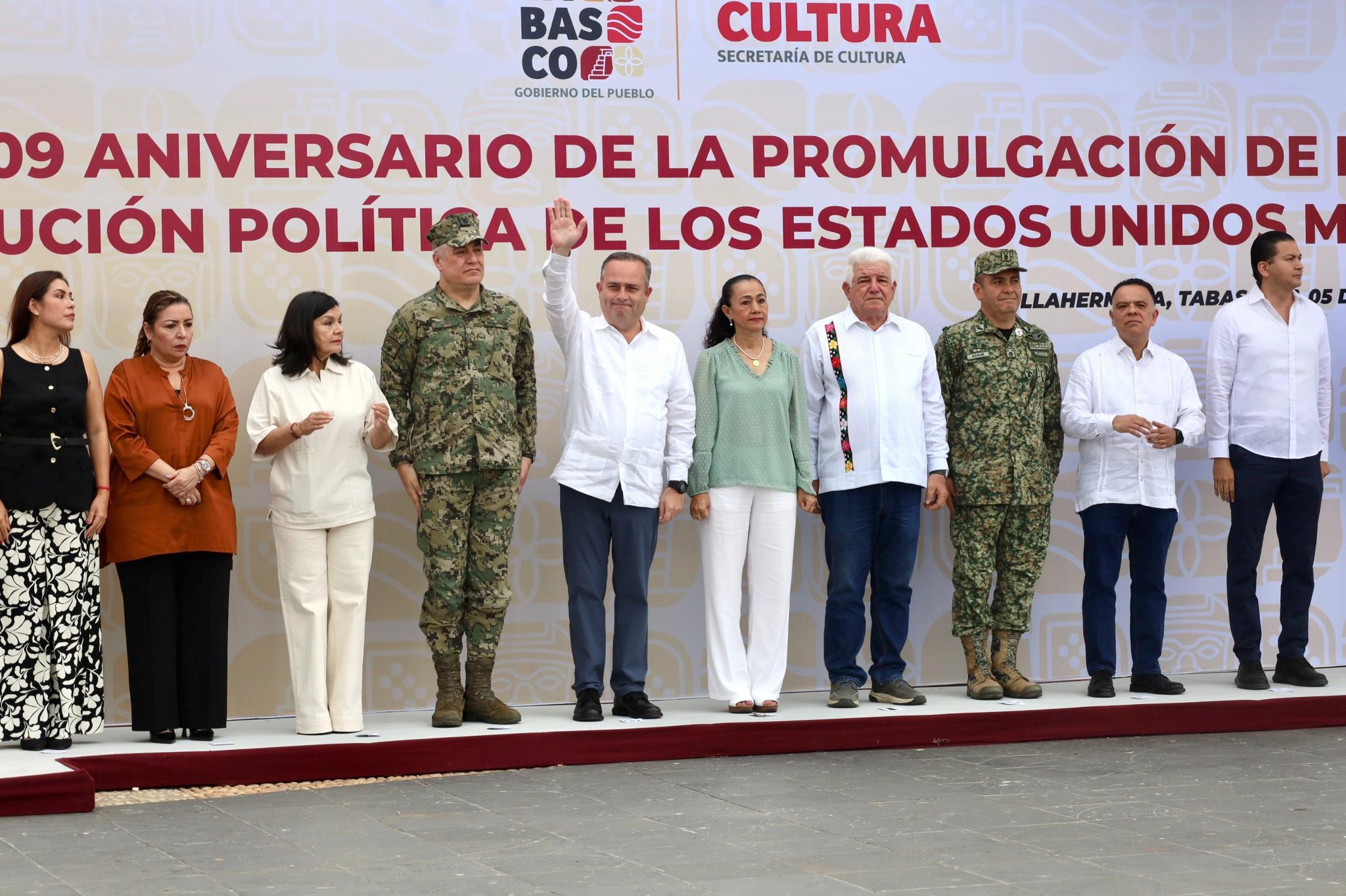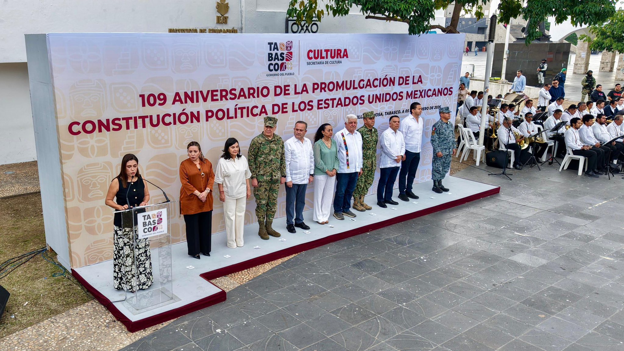 Autoridades de los tres órdenes de gobierno, encabezados por el secretario de Gobierno, José Ramiro López Obrador, en representación del gobernador Javier May Rodríguez, conmemoraron el 109 aniversario de la promulgación de la Constitución Política de los Estados Unidos Mexicanos, durante el acto cívico realizado en la explanada de Plaza de Armas, en el que estuvo presente la presidenta honoraria del sistema DIF Tabasco, Aurora Raleigh de la Cruz.