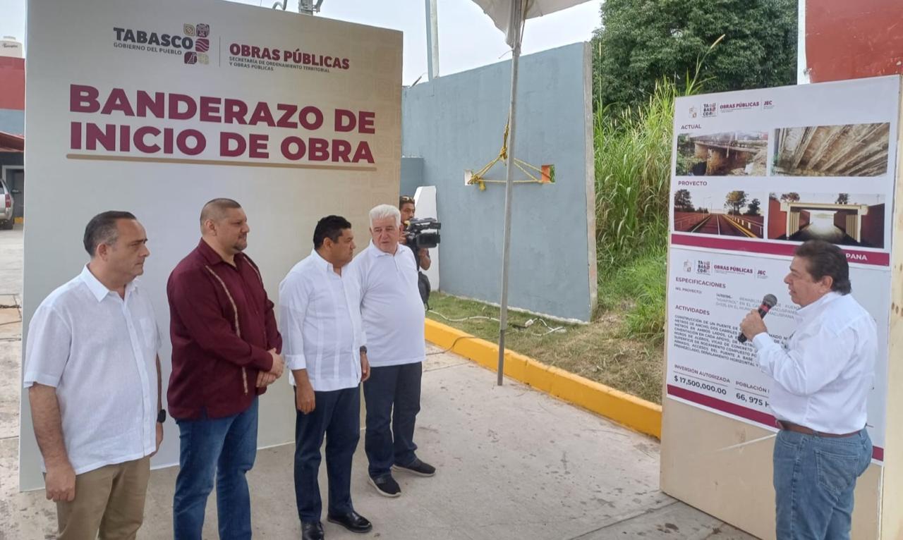 construcción del puente Huapinol, en Macuspana, el gobernador Javier May