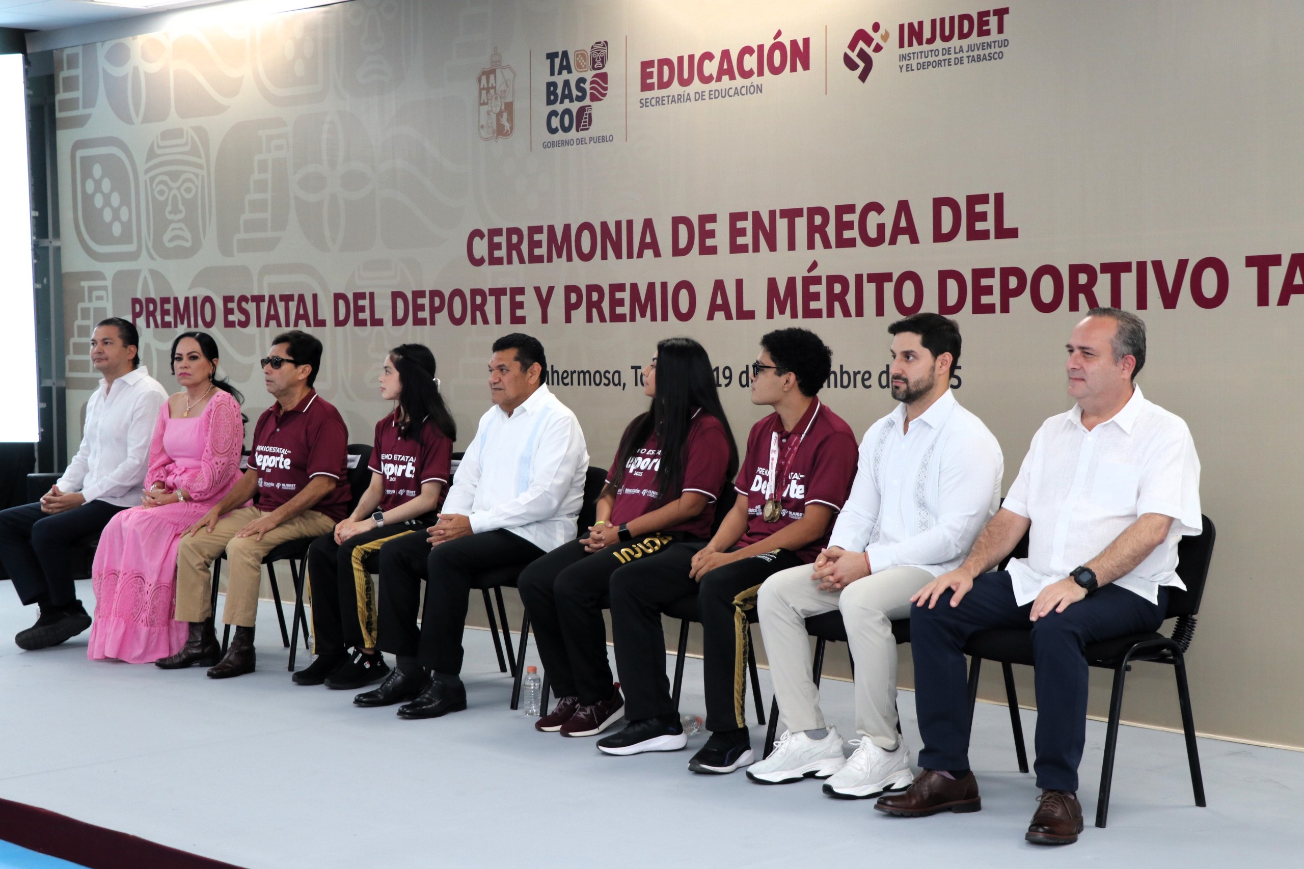 El gobernador Javier May Rodríguez y el titular del Instituto de la Juventud, y el Deporte de Tabasco (INJUDET), Gabriel Isaac Ruiz Pérez, encabezaron este miércoles la ceremonia de entrega de reconocimientos y estímulos del Premio Estatal del Deporte y el Premio al Mérito Deportivo Tabasqueño 2025.