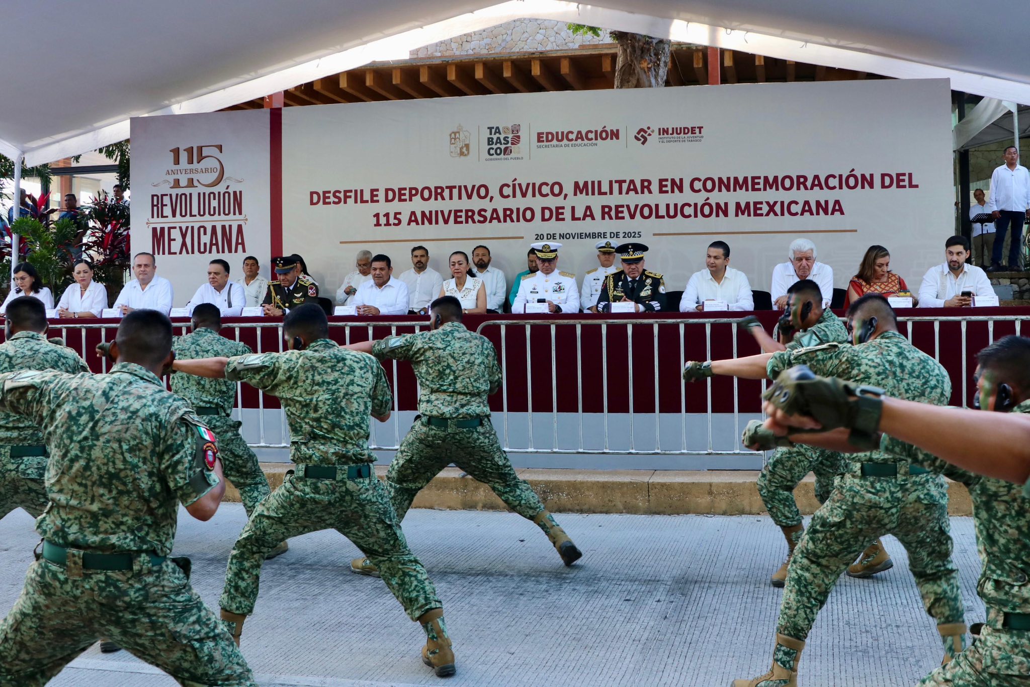 n el marco de la conmemoración del 115 Aniversario de la Revolución Mexicana, ante la presencia del gobernador, Javier May Rodríguez, se llevó a cabo el tradicional desfile del 20 de noviembre, en el que participaron escuelas de todos los niveles educativos, asociaciones civiles y agrupaciones deportivas, así como cuerpos de seguridad y fuerzas oficiales.